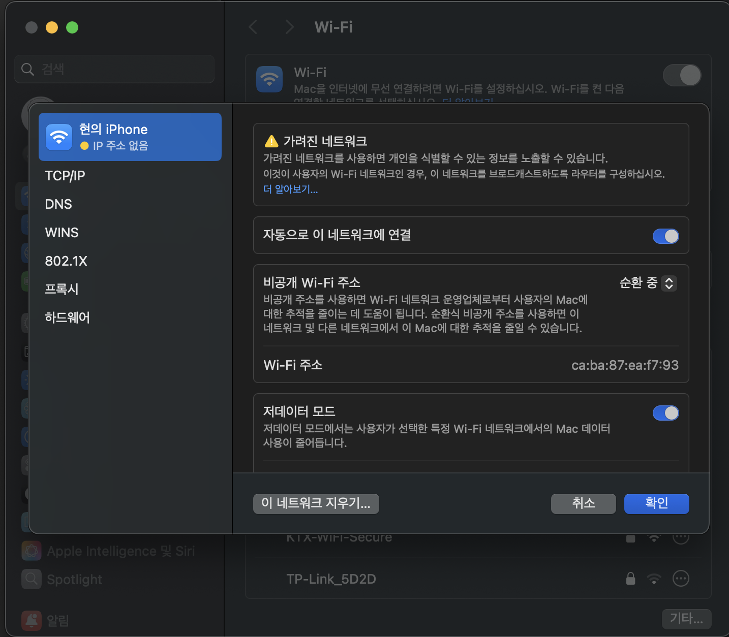 설정에서 Wifi에 들어가 연결된 핫스팟을 찾아줍니다.