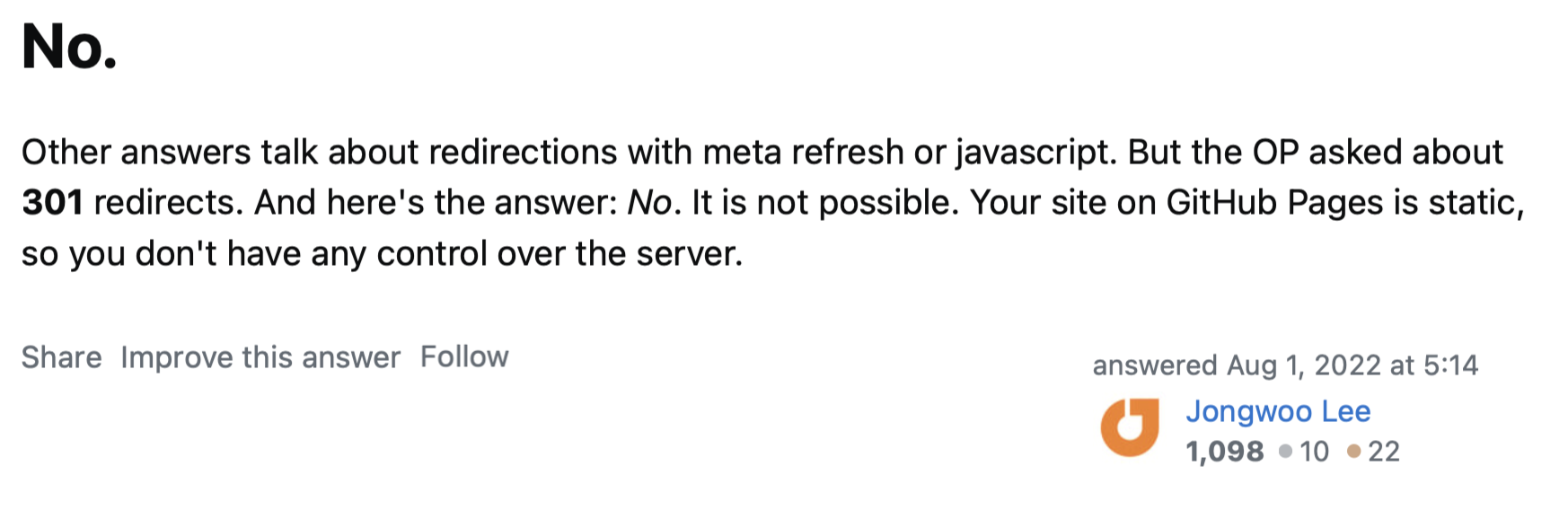 구글 서치 콘솔에서 사이트를 이전하기 위해서는 메타 태그 등을 통한 것이 아닌, HTTP 301 요청을 통한 리다이렉트를 제공해야 하는데 기본적으로 깃허브에서는 이를 지원하지 않습니다.